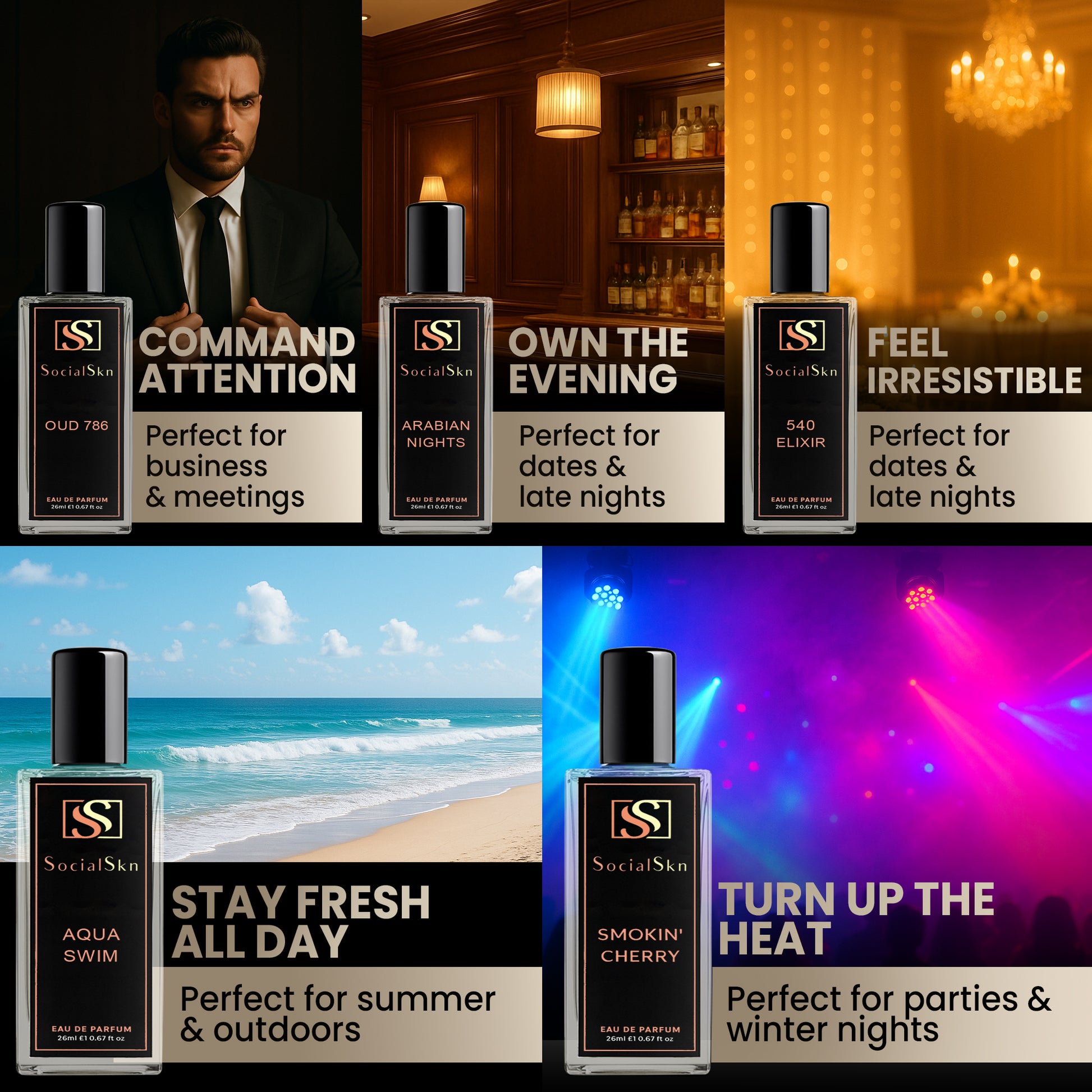 SocialSkn Signature Collection Luxury Unisex Perfume Gift Set (5x20ml) EDP | Includes OUD 786, Arabian Nights, 540 Elixir, Aqua Swim & Smokin’ Cherry | Travel Size | Christmas Unisex Gift Set