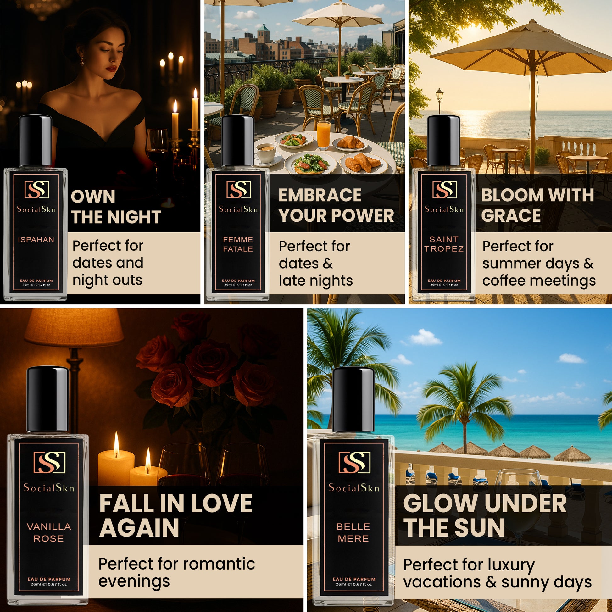 SocialSkn Signature Collection Luxury Women Perfume Gift Set (5x20ml) EDP | Includes Ispahan, Femme Fatale, Saint Tropez, Vanilla Rose & Belle Mare | Travel Size | Christmas Women Gift Set