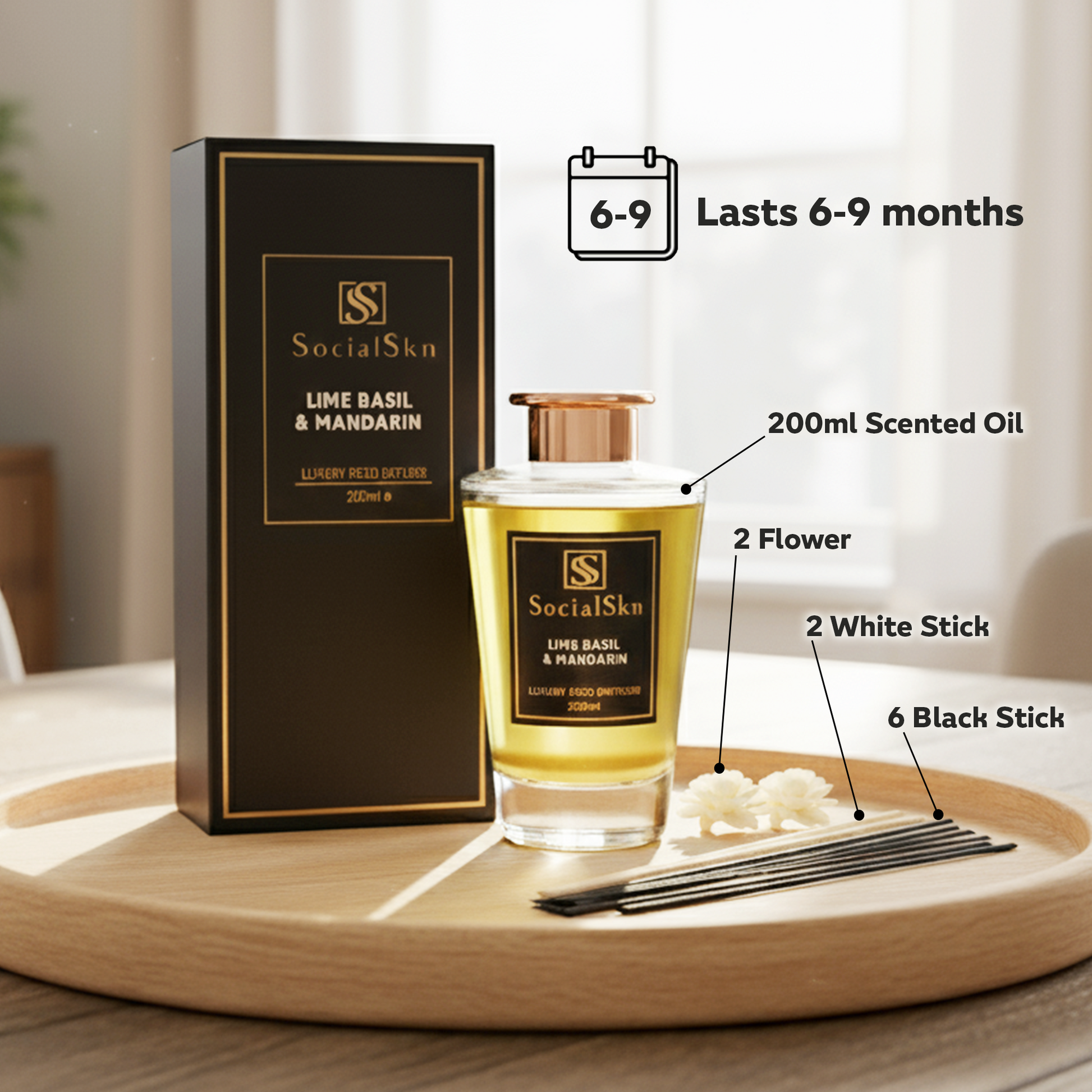- Luxury Gift: The SocialSkn reed diffuser boasts 30% fragrance oil content, ensuring a rich and premium scent experience. With a lifespan of 4-6 months, it offers a long lasting fragrance. Presented in a premium, giftable box, the diffuser is elegantly housed in a cream-colored velvet drawstring pouch giving it an opulent touch.
