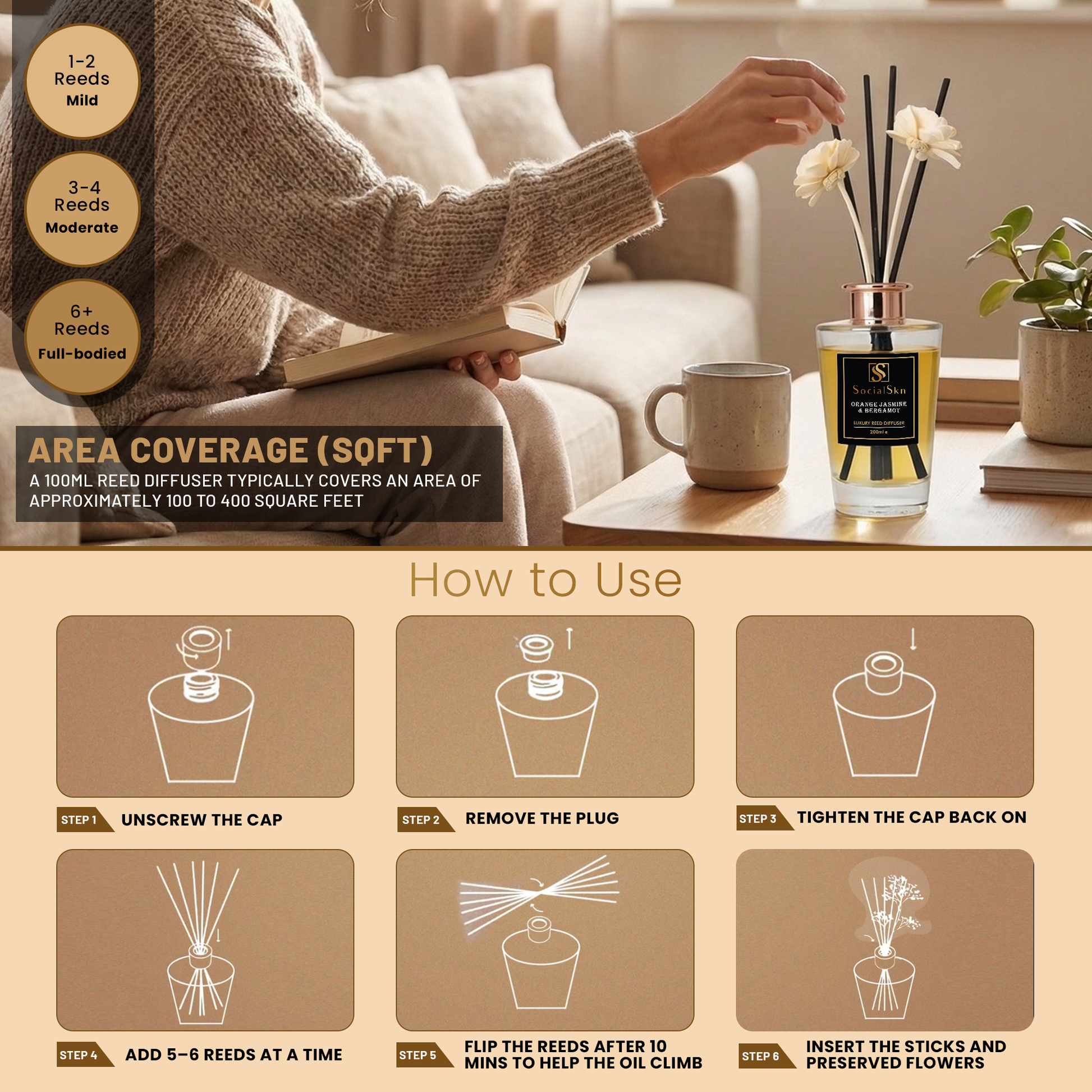 - How to use: Remove the bottle cap and insert the reed sticks, along with the included flowers, into the bottle. Flip the sticks 2-3 times initially to absorb the oil. Swirl the scented oil with the sticks twice a week for optimal fragrance release. Rotate the reed sticks every few days to ensure even dispersion of the scent.