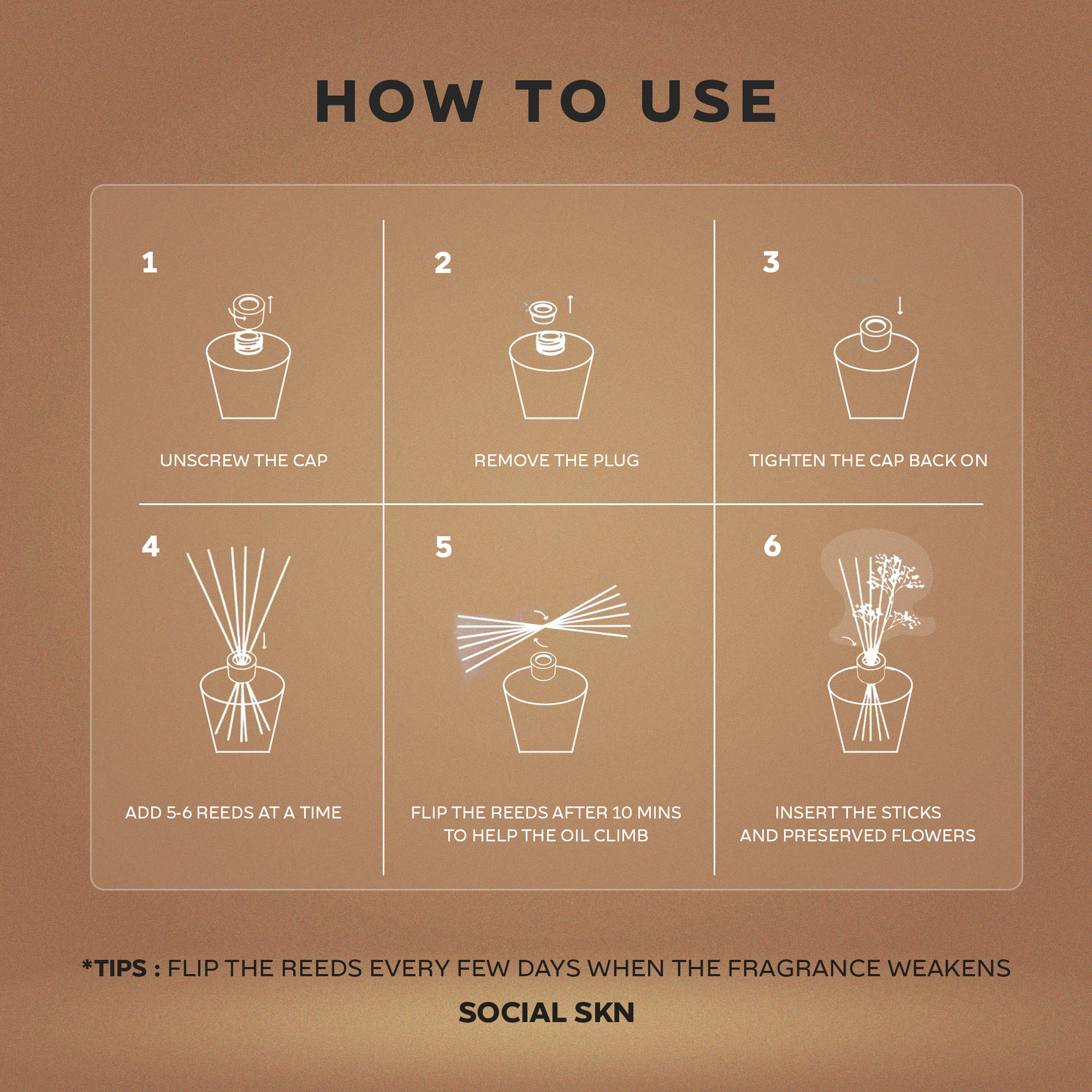 - How to use: Remove the bottle cap and insert the reed sticks, along with the included flowers, into the bottle. Flip the sticks 2-3 times initially to absorb the oil. Swirl the scented oil with the sticks twice a week for optimal fragrance release. Rotate the reed sticks every few days to ensure even dispersion of the scent.