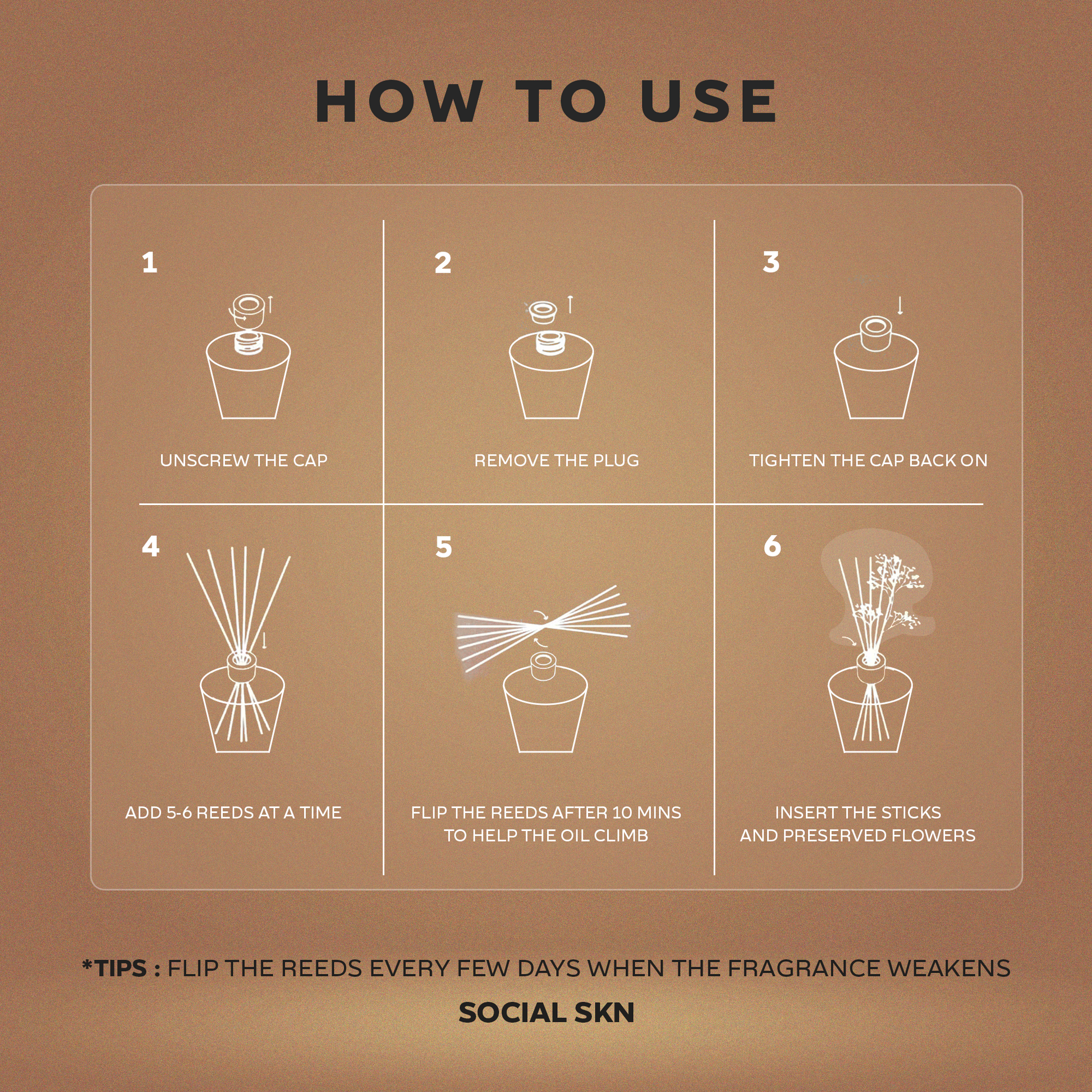 - How to use: Remove the bottle cap and insert the reed sticks, along with the included flowers, into the bottle. Flip the sticks 2-3 times initially to absorb the oil. Swirl the scented oil with the sticks twice a week for optimal fragrance release. Rotate the reed sticks every few days to ensure even dispersion of the scent.